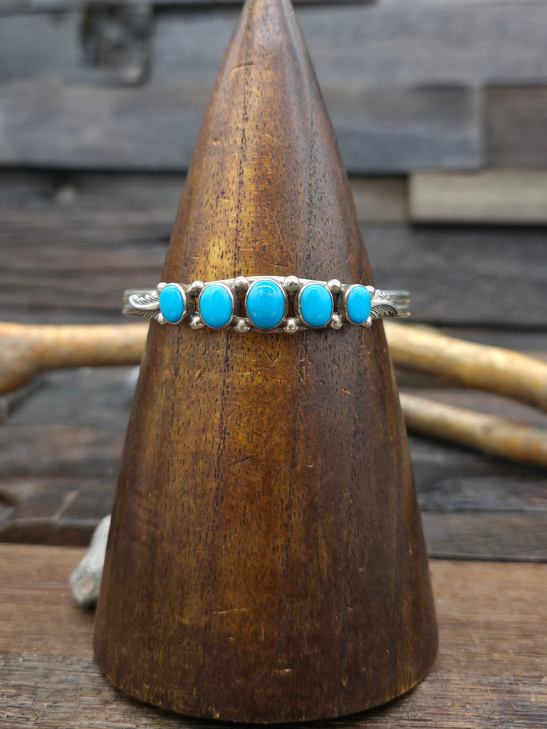 Five Stone Sterling Silver Turquoise Cuff Bracelet.  Stamped "S" by a Navajo silversmith.  Individual stones will vary. All jewelry i handcrafted b...