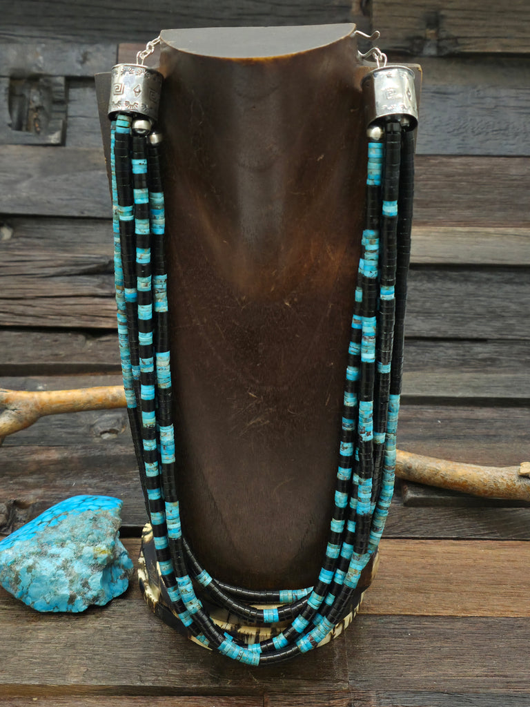 5 Strand Blue Turquoise and Jet Necklace 20in w/6in Extender by Fred Archuleta
