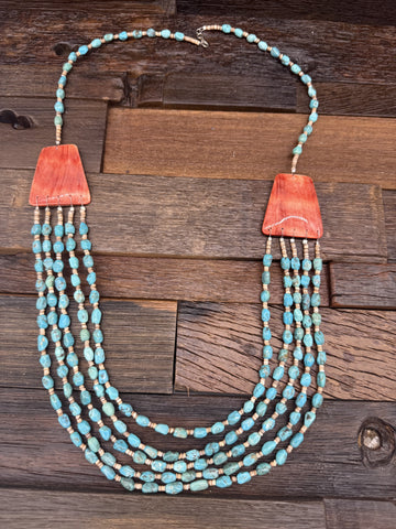 5 Strand Blue Turquoise with Spiny Oyster Tabs Necklace by Elaine Lovato