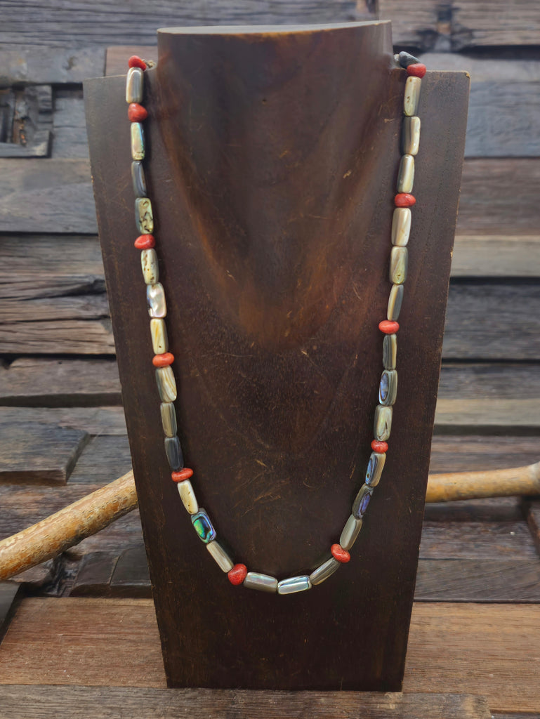 Abalone and Apple Coral Necklace by Santo Domingo jewelry artist Angie Crespin. All jewelry is handcrafted by Indigenous Artists.  Dimensions: L...