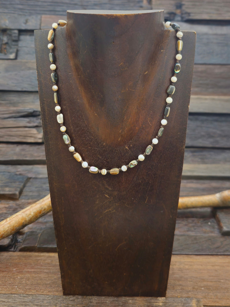Abalone Shell and Agate Necklace. All jewelry is handcrafted by Indigenous Artists.  Dimensions: Length - 16 in w/2 in. extender