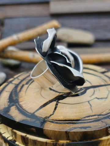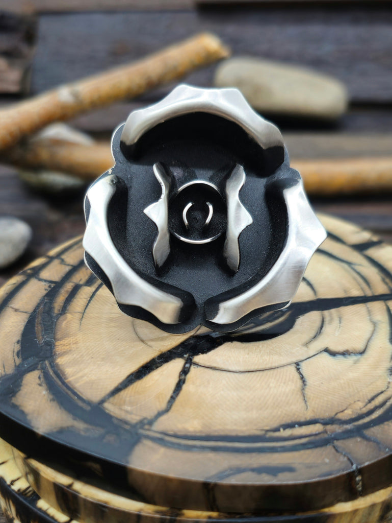 Adjustable Stamped Sterling Silver Rose Ring by Leander Tahe