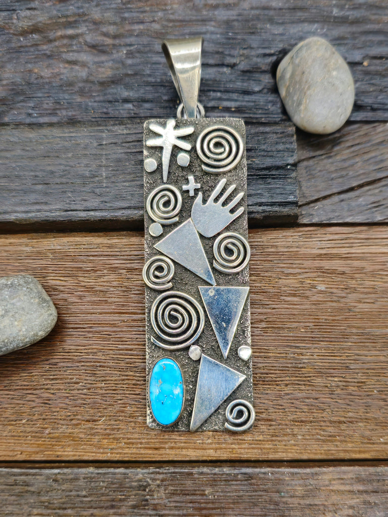 This beautiful sterling silver and turquoise pendant is made by renown Navajo silversmith Alex Sanchez in his signature petroglyph style. All jewel...