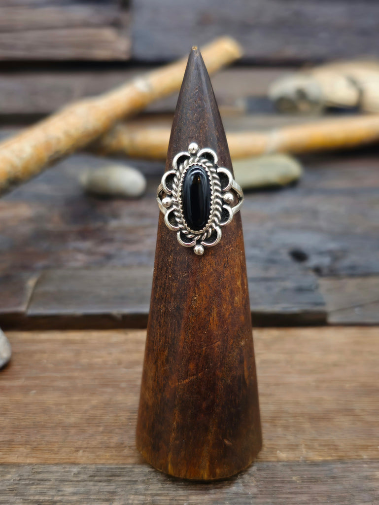 Black Onyx Sterling Silver Ring by Navajo silversmith Priscilla Smith. All jewelry is handcrafted by Indigenous Artists. Individual stones will var...