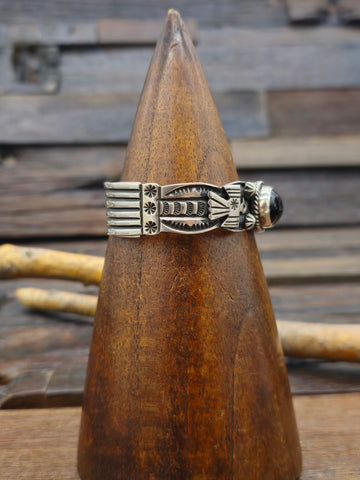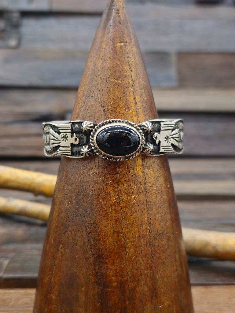 Black Onyx Sterling Silver Thunderbird Cuff by Navajo silversmith Andy Cadman. Individual stones and stamp work may vary.  All jewelry is handcraft...