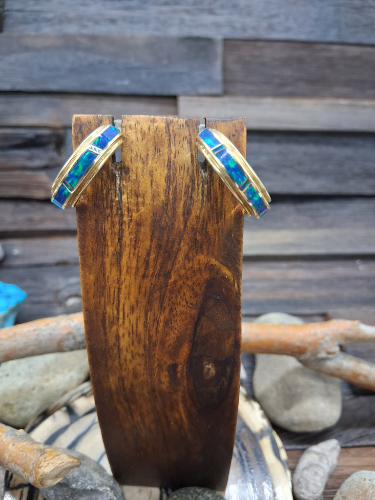 Blue Fire Opal 14kt Gold Inlay Hoop Post Earrings