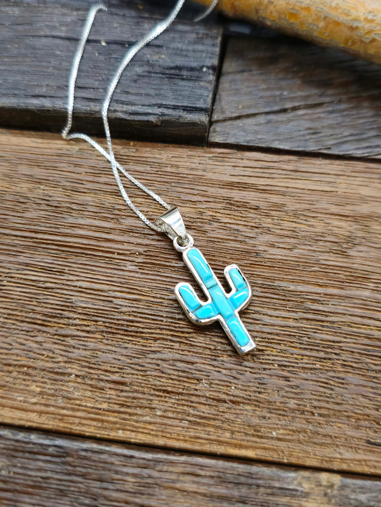 Blue Turquoise Inlay Cactus Pendant on 18 in. Sterling Silver Chain by Jane Francisco.  Individual stones will vary. All jewelry is handcrafted by ...