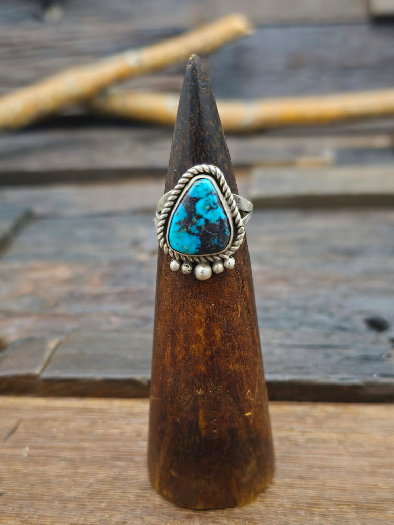 Blue Turquoise Oxidized Sterling Silver Ring.  Stamped "TR" by a Navajo silversmith. All jewelry is handcrafted by Indigenous Artists. Individual s...