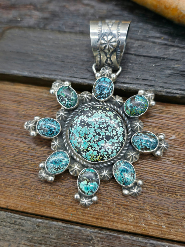 Blue Turquoise Round Cluster Pendant by Navajo silversmith Rosella Paxton. Individual stones and coin years may vary. All jewelry is handcrafted by...