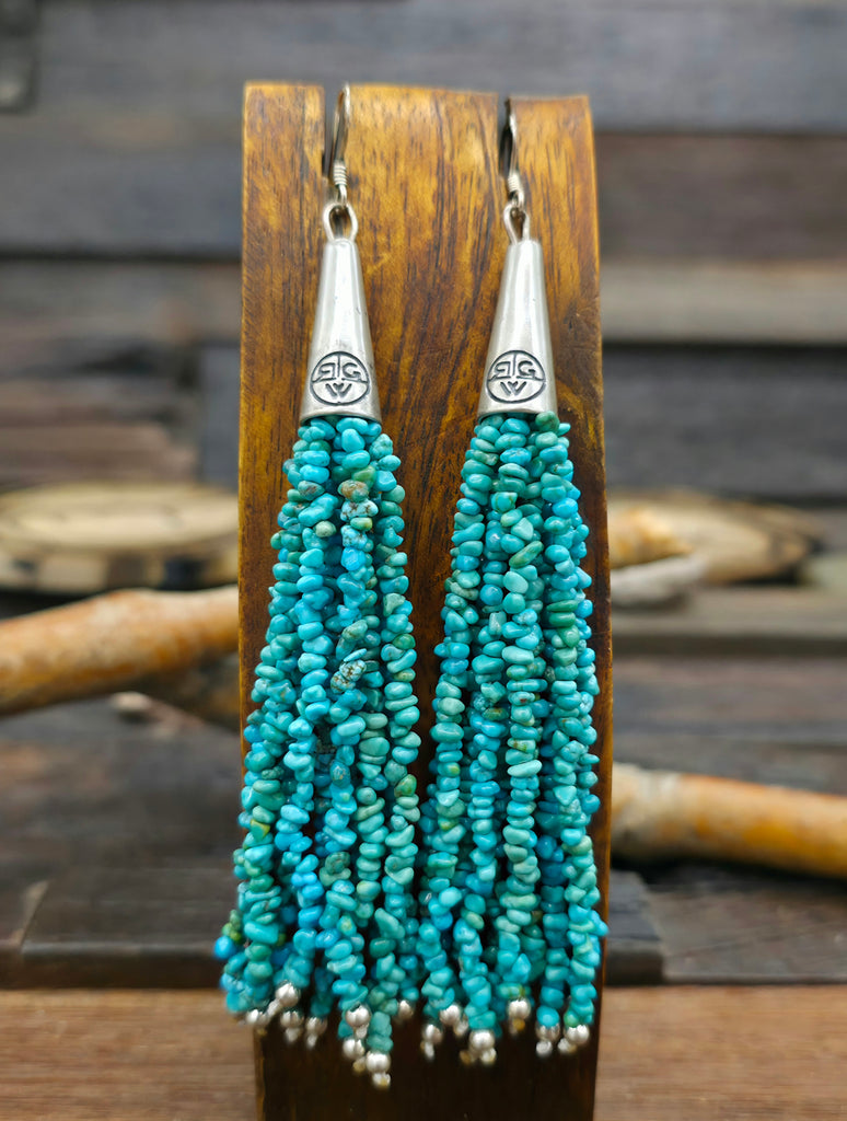 Bright Blue Turquoise Stone Bead Tassel Earrings with Sterling Silver cones and French Hooks. All jewelry is handcrafted by Indigenous Artists.  ...