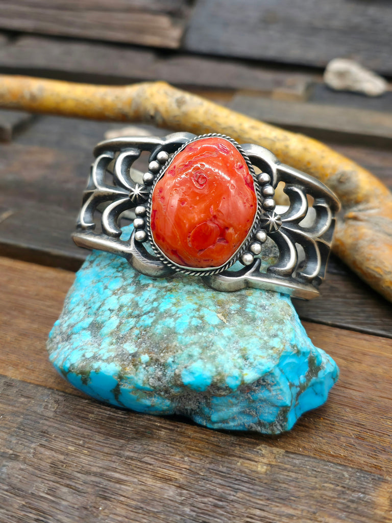 Cast Sterling Silver Coral Cuff by Navajo silversmith Henry Sam. All jewelry is handcrafted by Indigenous Artists.  D8imensions: Internal Circum...