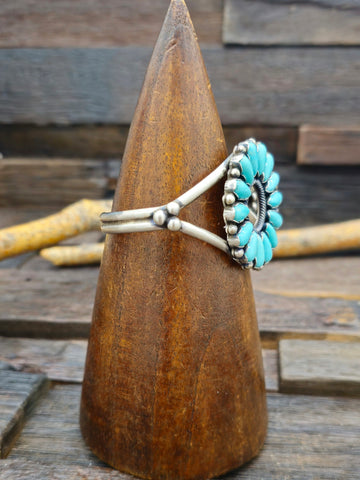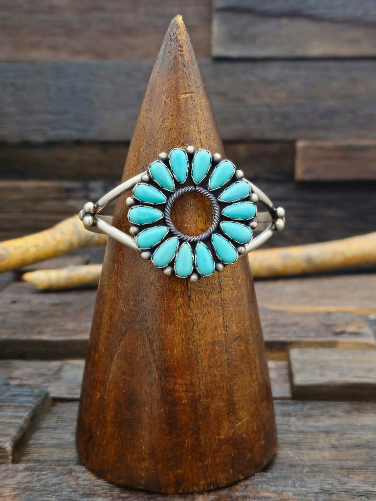 Oxidized sterling silver bracelet featuring a circular cluster of blue-green turquoise teardrops set in scalloped bezels.  Made by Navajo silversmi...