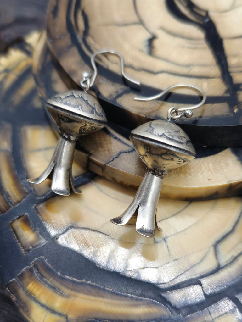 Mercury Dime Squash Blossom Earrings. All jewelry is handcrafted by Indigenous Artists.  Dimensions: 1 3/4 in. by 1/2 in.