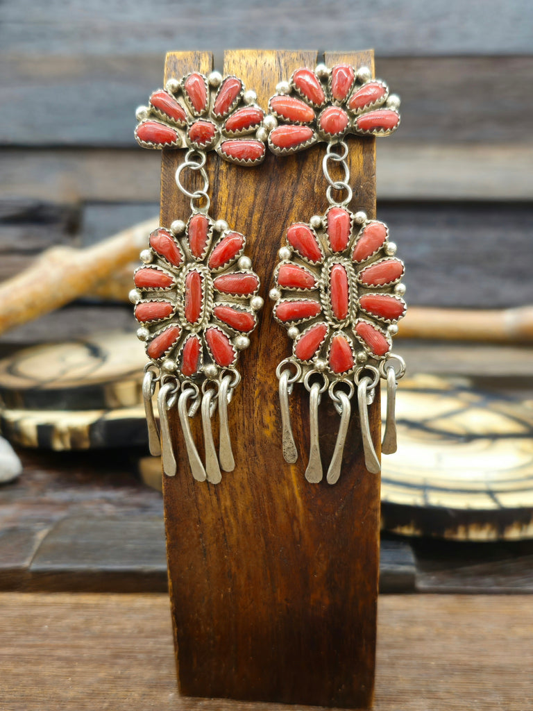 Coral Cluster Earrings with Sterling Silver Dangles by Zuni silversmith Harry Melikan. All jewelry is handcrafted by Indigenous Artists.  Dimens...