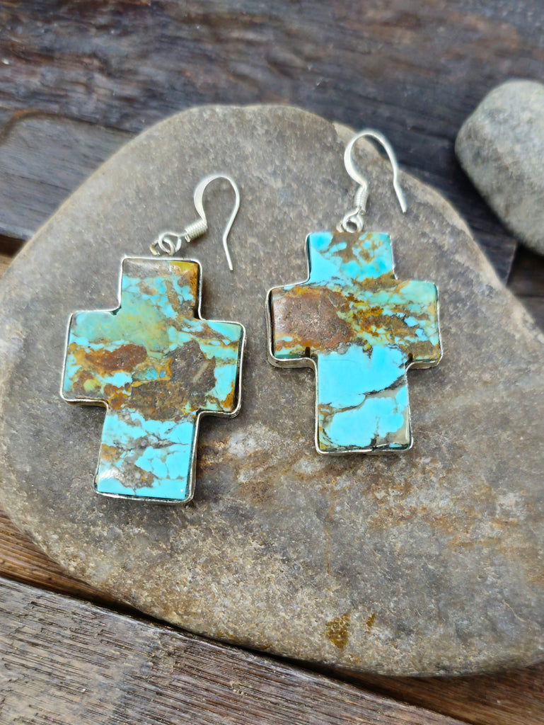 Cross Turquoise and Sterling Silver Slab Earrings by Veronica Tortalita. All jewelry is handcrafted by Indigenous Artists. Stones and matrix patter...