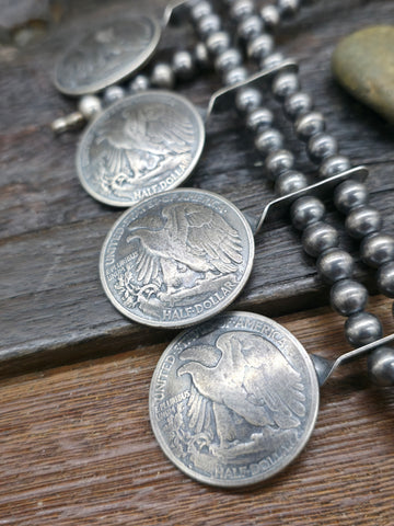 Eagle Half Dollar Coin Silver Squash Blossom Necklace.  Coin years range from the 1930s to the 1940s. All jewelry is handcrafted by Indigenous Arti...