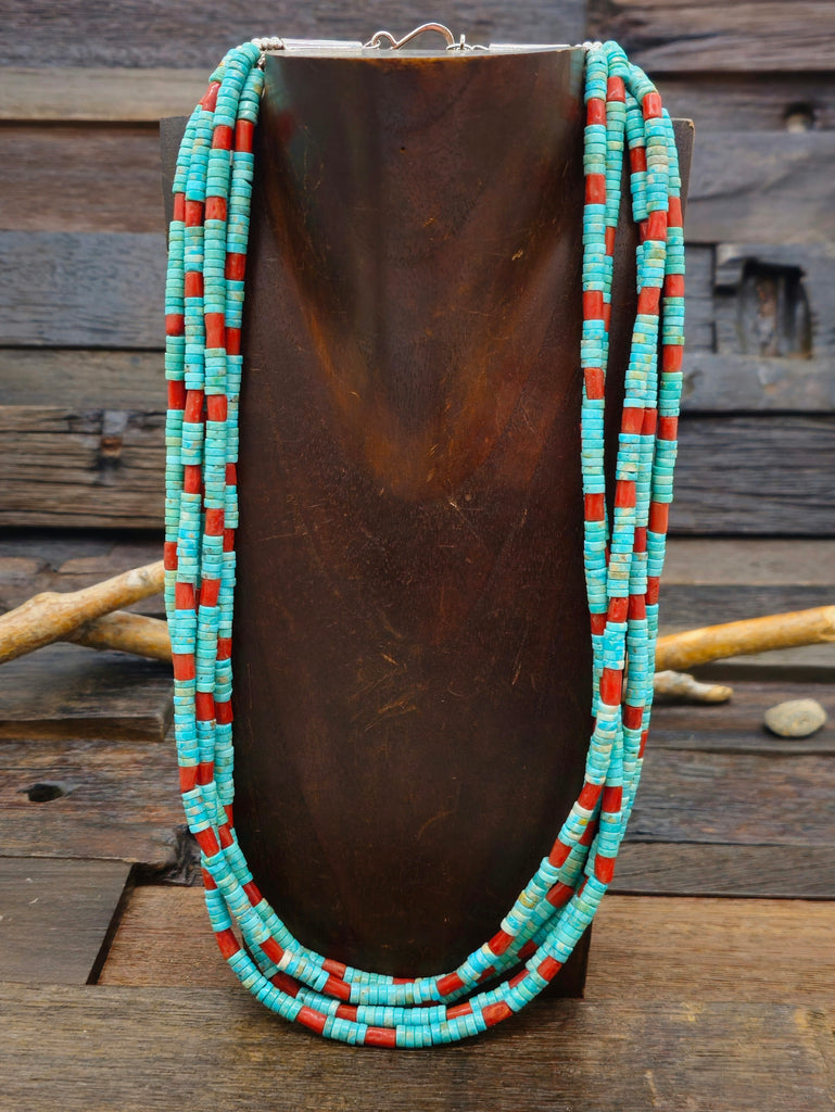 Five Strand Blue Turquoise and Coral Necklace by Fred Archuleta - 30 in