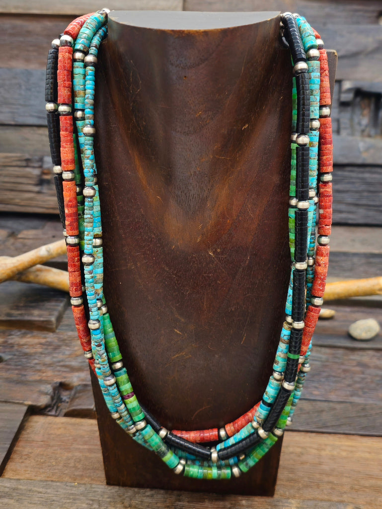 Five Strand Sterling Silver Multistone Bead Necklace by Fred Archuleta. Stones used include blue and green turquoise, sponge coral, and jet. Indivi...