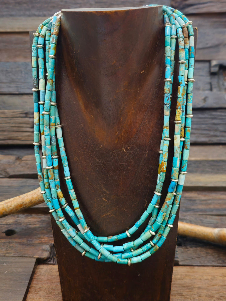 Five Strand Turquoise and Sterling Silver Bead Necklace  All jewelry is handcrafted by Indigenous Artists.   Dimensions: Length - 20 in. + 9 ...