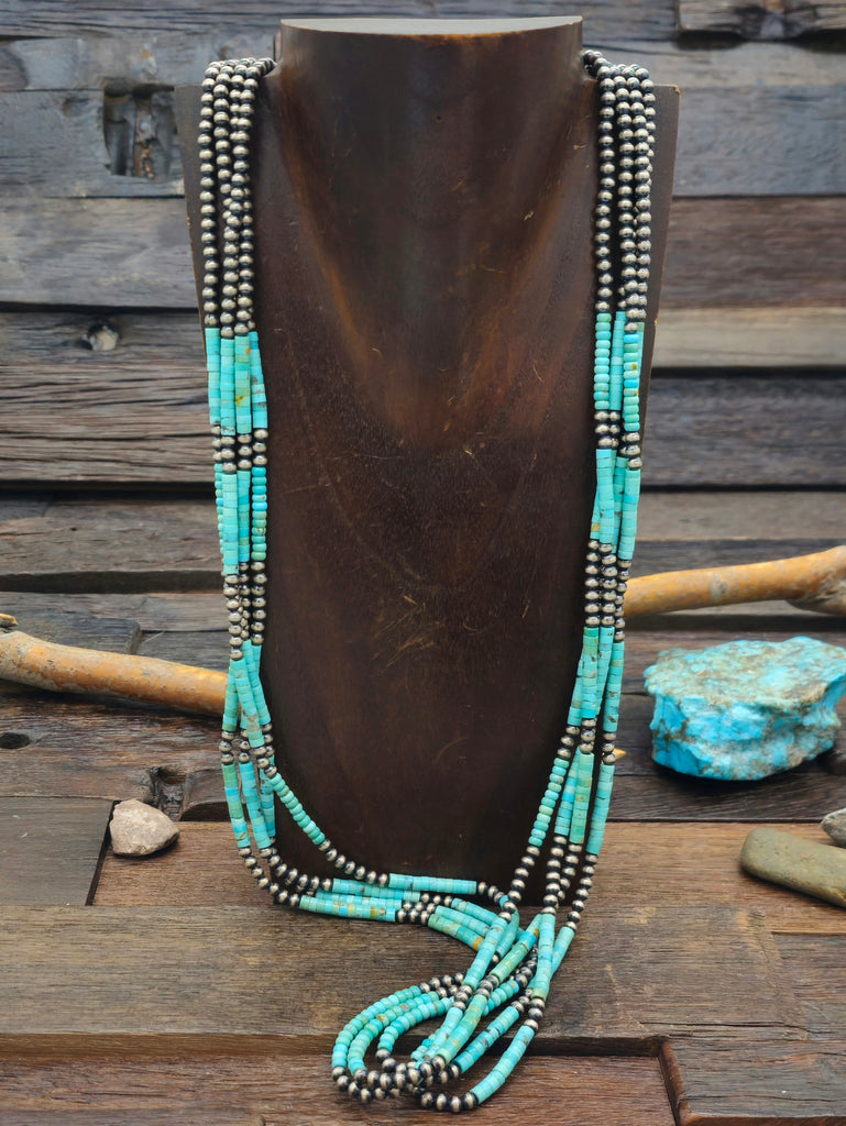 Four Strand Blue Turquoise Heishi and Sterling Silver Bead Necklace All jewelry is handcrafted by Indigenous Artists.  Dimensions: Length - 33 i...