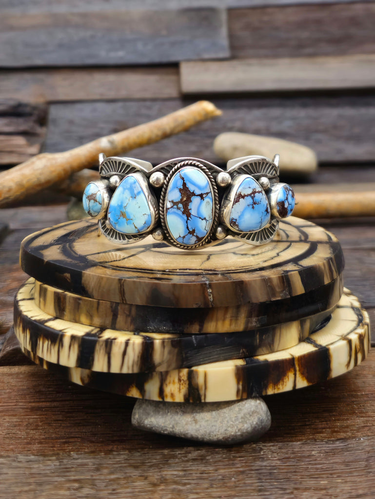 Five Stone Golden Hill Sterling Silver Cuff by Navajo silversmith Albert Jake. All jewelry is handcrafted by Indigenous Artists.  Dimensions: In...