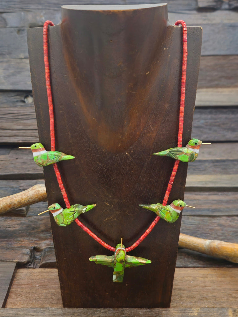 Green and Copper Composite Five Hummingbird Necklace with Sponge Coral.  Hand carved hummingbird fetishes feature sterling silver beaks.  Dimens...