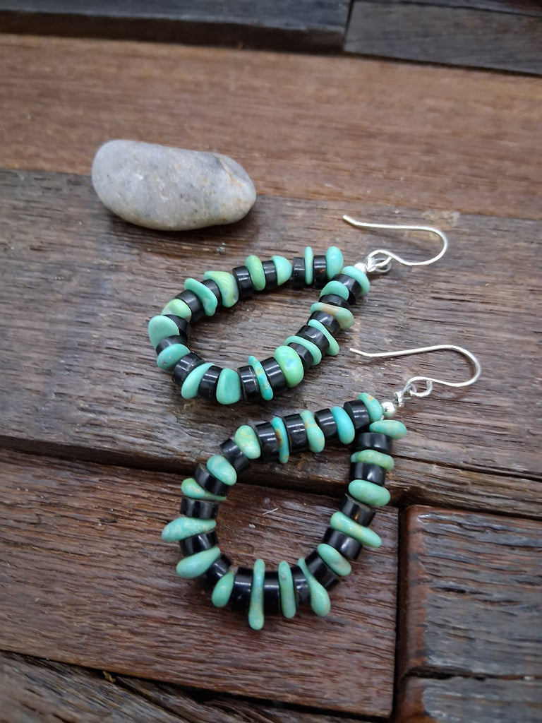 Green Turquoise and Jet Stone Bead Loop Earrings.  Individual stones will vary. All jewelry is handcrafted by Indigenous Artists.  Dimensions: 2...