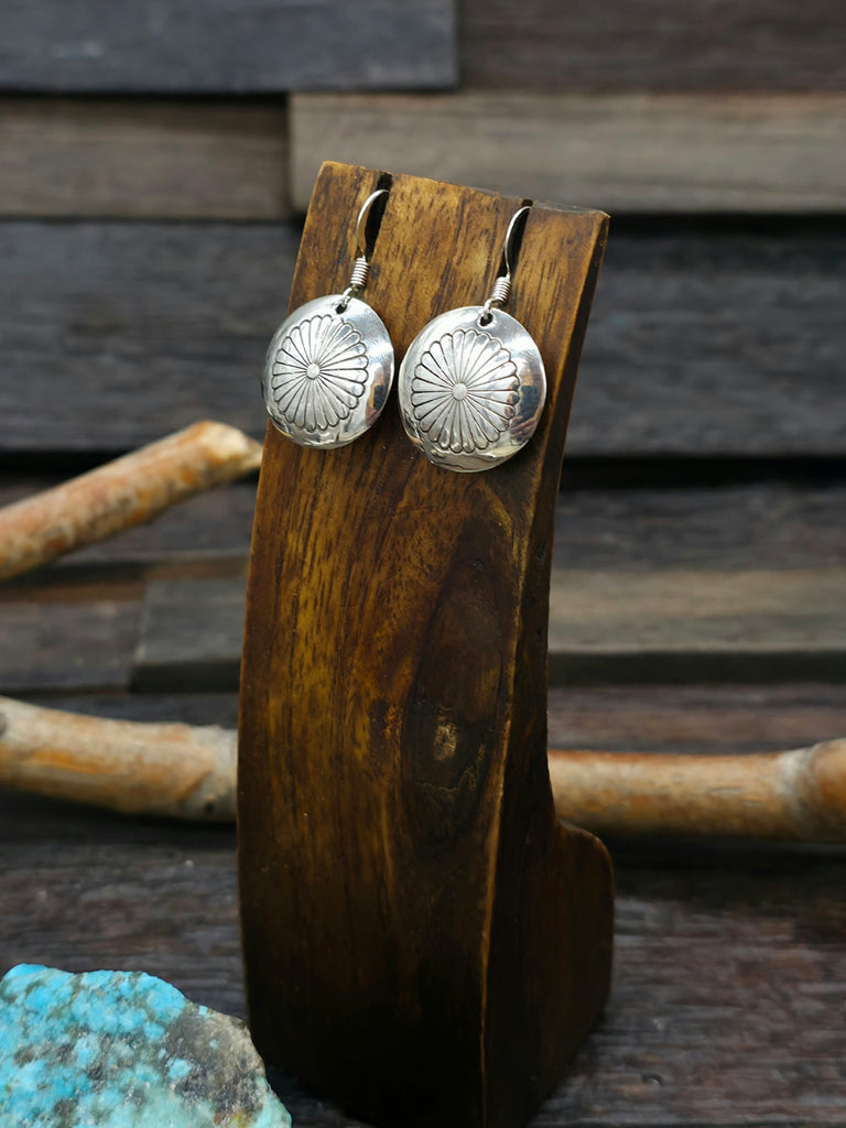 Silver Stamped Pillow Hook Dangle Earrings by Navajo silversmith Ina Nez. All jewelry is handcrafted by Indigenous Artists.  Dimensions: 3/4inch