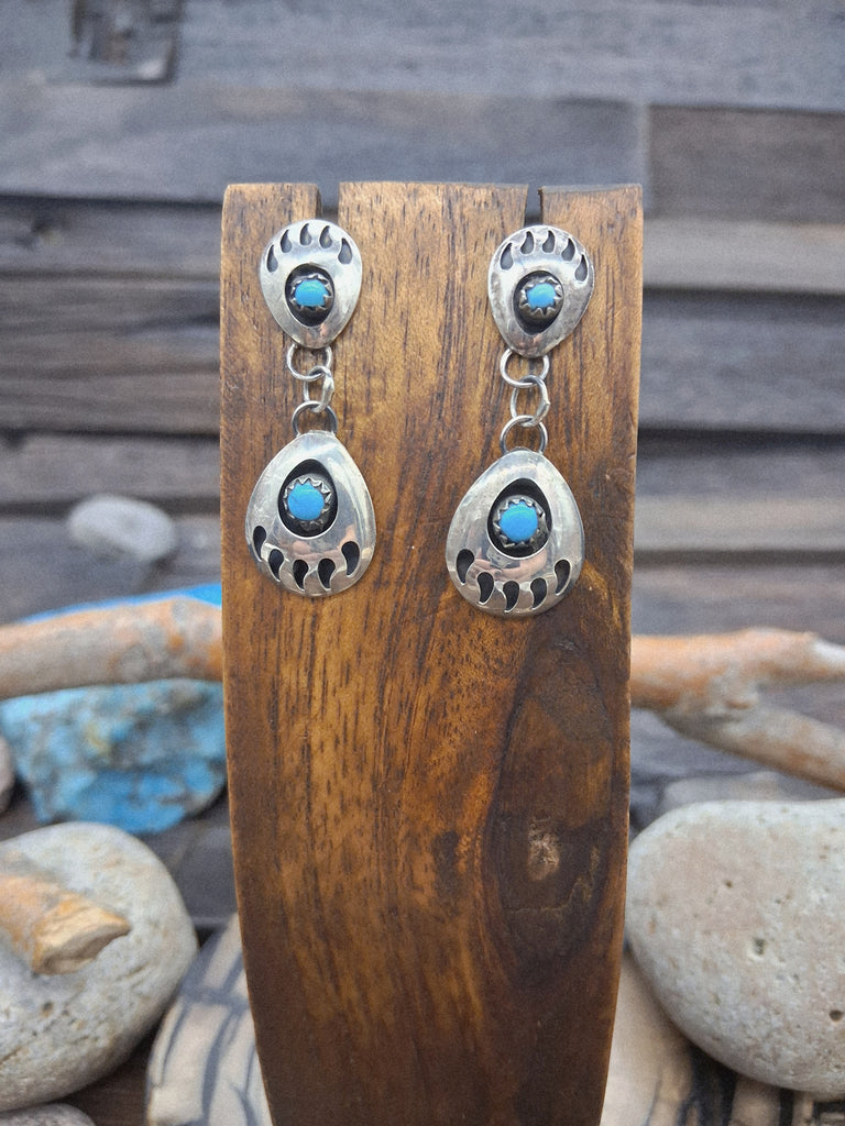 These post earrings feature two shadowbox bear paws and delicate turquoise stones. All jewelry is handcrafted by Indigenous Artists.  Dimensions...