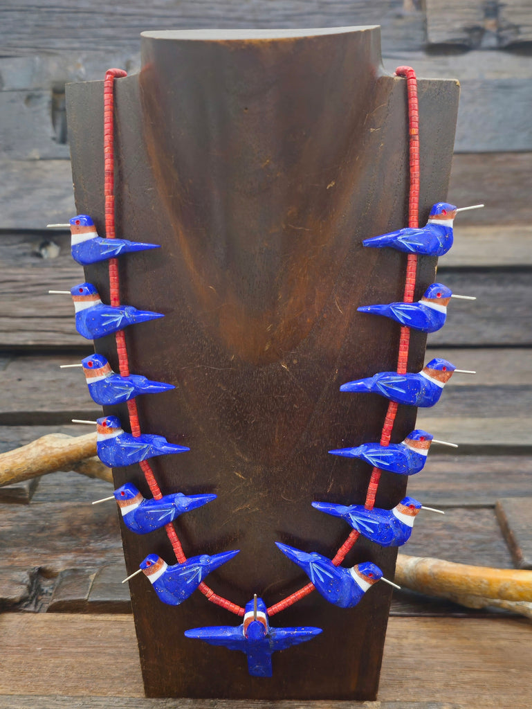 Lapis 13 Hummingbird Necklace with Orange Sponge Coral Heishi by local artist Matt Mitchell.  Hand carved hummingbird fetishes feature sterling sil...