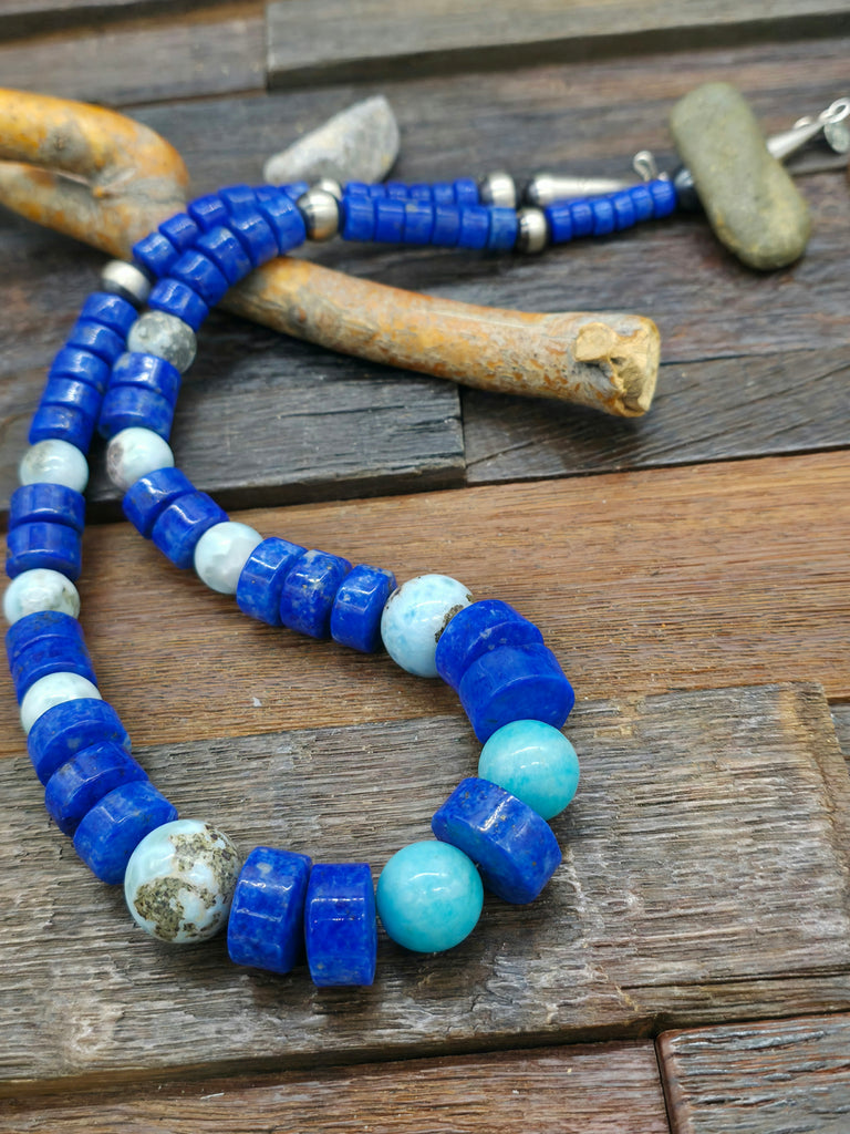 Lapis Lazuli and Larimar Bead Necklace by Fred Archuleta. All jewelry is handcrafted by Indigenous Artists.  Dimensions: Length - 24 in.