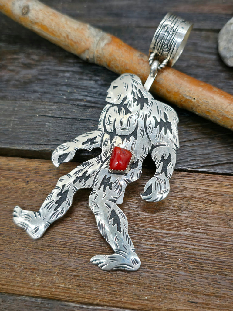 Large Sterling Silver and Coral Bigfoot Pendant by Navajo silversmith Richard Singer. All jewelry is handcrafted by Indigenous Artists.  Dimensi...