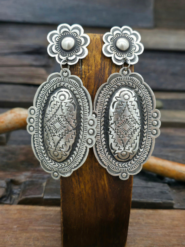 Large earrings by Navajo silversmith Leander Tahe.  Light enough to wear all day! All jewelry is handcrafted by Indigenous Artists.  Dimensions:...