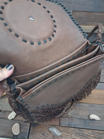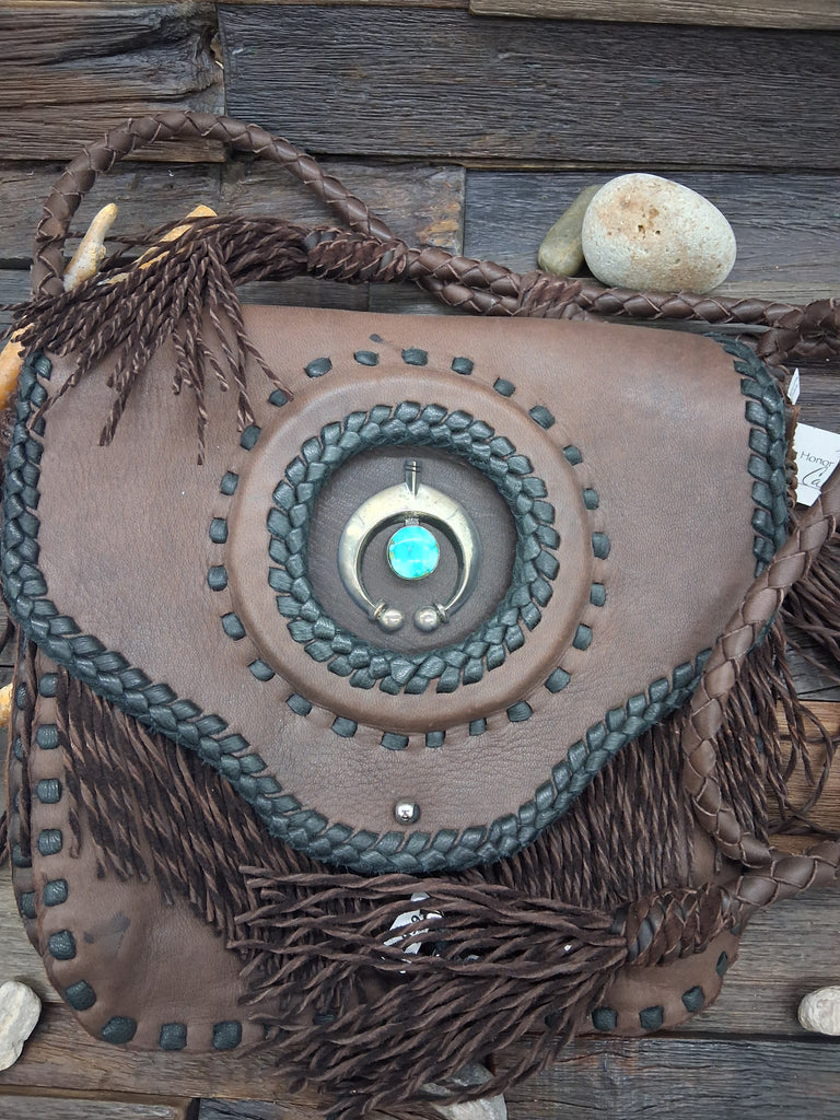 Deep Brown Leather Purse in Honor of Agua Caliente with Sterling Silver Naja and Turquoise.  Dimensions: Strap: 42in Purse: 10in by 11in