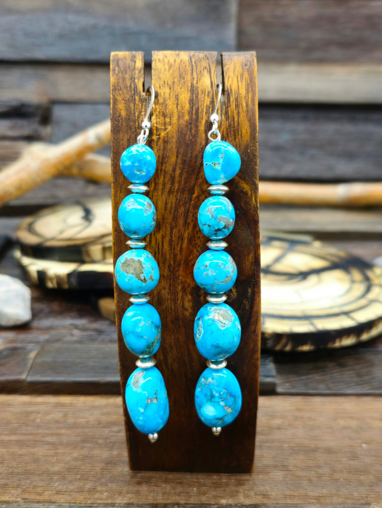Long Turquoise Nugget Earrings by Fred Archuleta. All jewelry is handcrafted by Indigenous Artists.  Dimensions:  4 in. by 1/2 in.