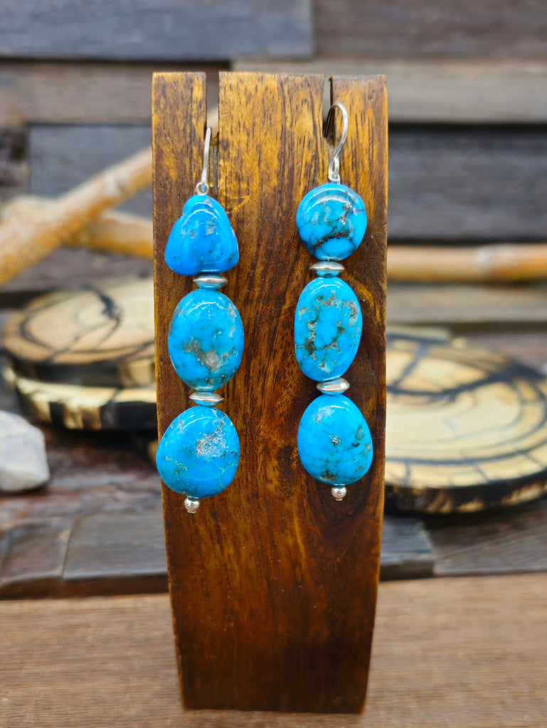 Long Turquoise Nugget Earrings by Fred Archuleta. All jewelry is handcrafted by Indigenous Artists.  Dimensions:  3 in. by 1/2 in.