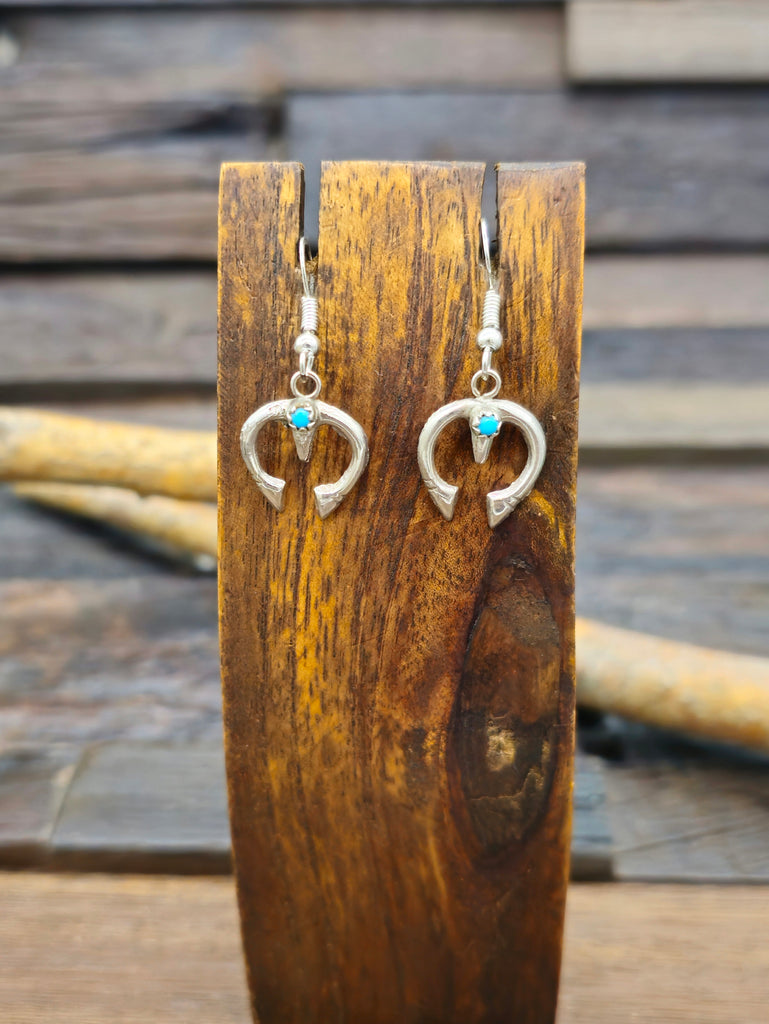 These earrings by Navajo silversmith Sylvia Chee feature a tiny turquoise stone set in a high-shine sterling silver naja dangling from a French hoo...