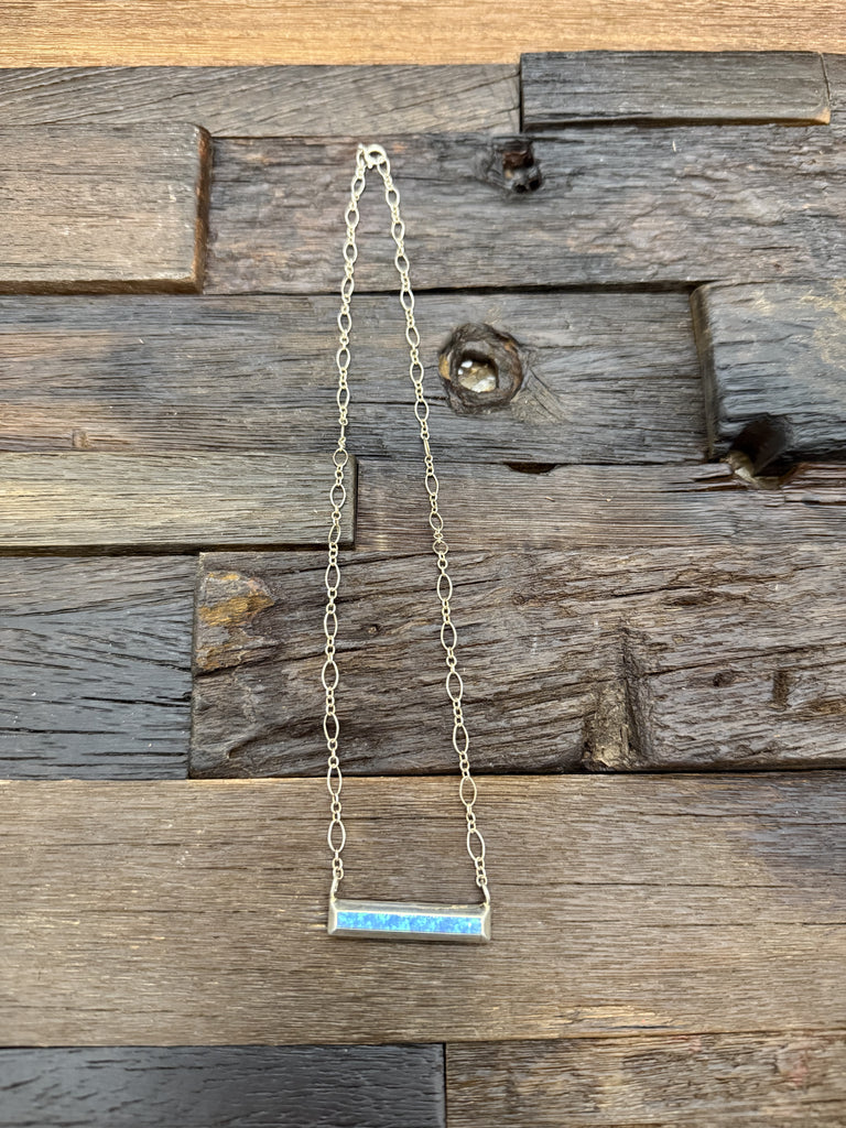 This necklace features a bar or man-made opal hanging from a high-shine sterling silver chain, made by Navajo artist J. Natachu. All jewelry is han...