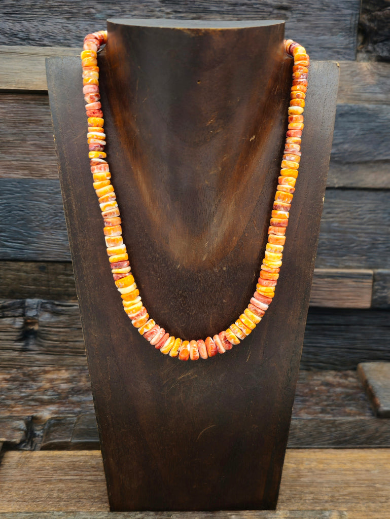 Orange Spiny Oyster Disc Necklace by Santo Domingo jewelry artist Ramona Bird. All jewelry is handcrafted by Indigenous Artists.  Dimensions: Le...
