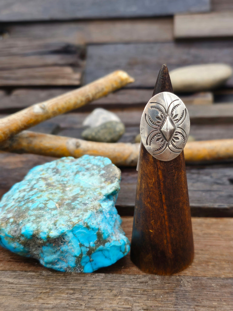 Oval Stamped Coin Silver Ring.  Individual stamp work will vary. All jewelry is handcrafted by Indigenous Artists.  Dimensions: 1 in. by 3/4 in....