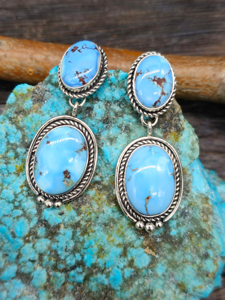 Oval Two-Stone Golden Hill Earrings.  Stamped "D" by a Navajo silversmith. Individual stones re natural and will vary.  Dimensions: Length - 1 3...