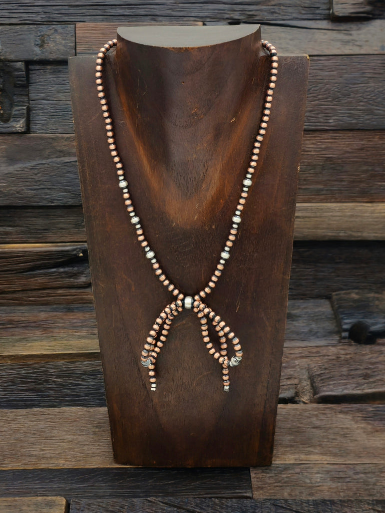 Oxidized Copper Bead Bow Necklace with Sterling Silver Accents. All jewelry is handcrafted by Indigenous Artists.  Dimensions: Length - 16 in.  ...