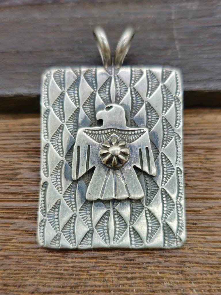 Oxidized, stamped sterling silver pendant featuring stamped thunderbird applique with repousse star shot.  Made by a Navajo silversmith. All jewelr...
