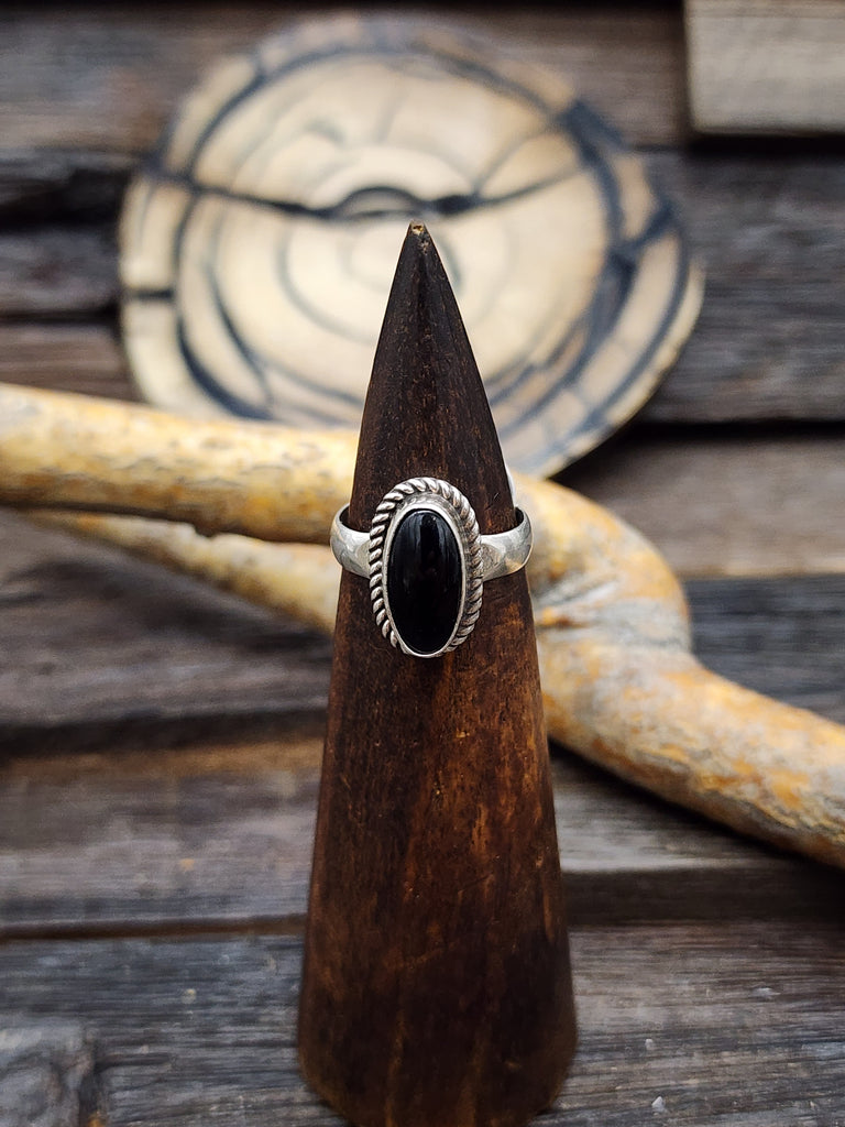This petite oval onyx sterling silver ring is Native American handcrafted by Navajo artist Prescilla Smith.