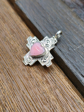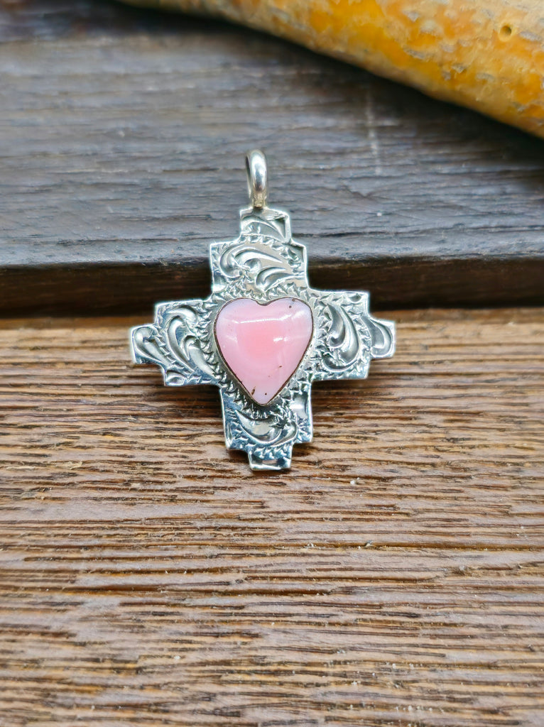 Pink Conch Heart Sterling Silver Zia Pendant. All jewelry is handcrafted by Indigenous Artists.  Dimensions: 1 in. by 1 in.