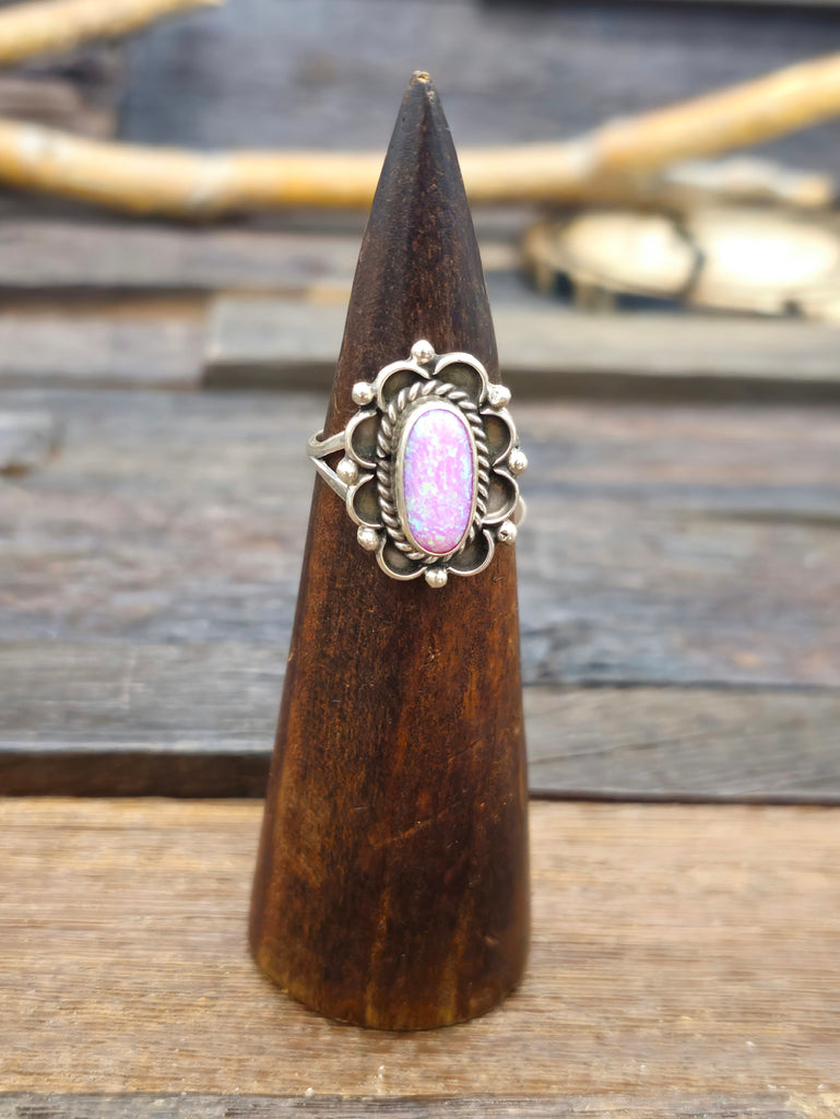 Pink Lab Opal Sterling Silver Ring by Navajo silversmith Priscilla Smith. All jewelry is handcrafted by Indigenous Artists. Individual stones will ...