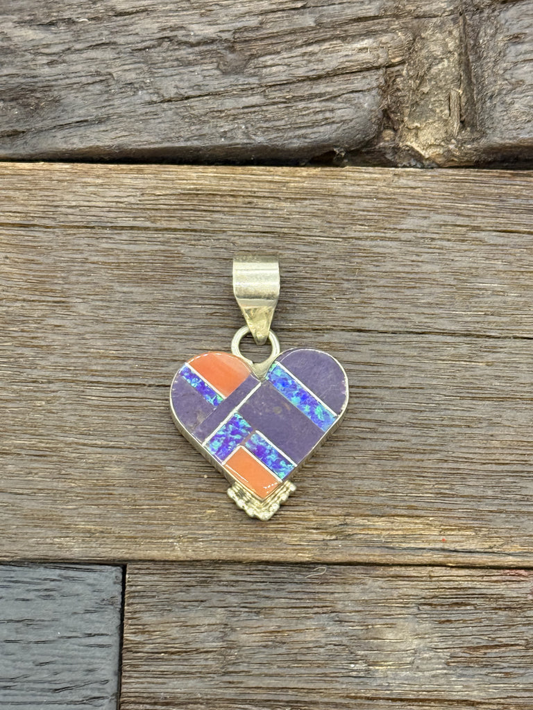 Sterling silver inlaid heart pendant with purple mojave, lab opal and spiny oyster shell. Made by Navajo artist signed Yazzie and measures 1 1/2" f...