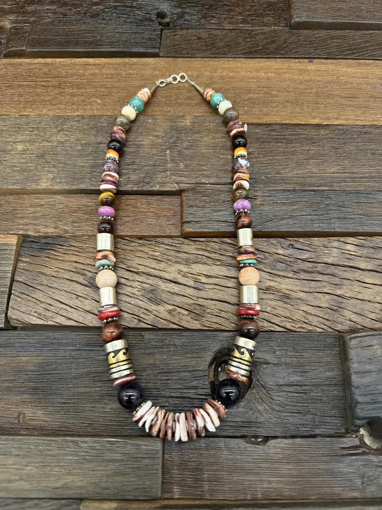 This purple spiny necklace features an array of beautiful stones as well as sterling silver and brass beads made by Navajo jewelry artist Rose Sing...