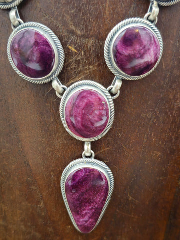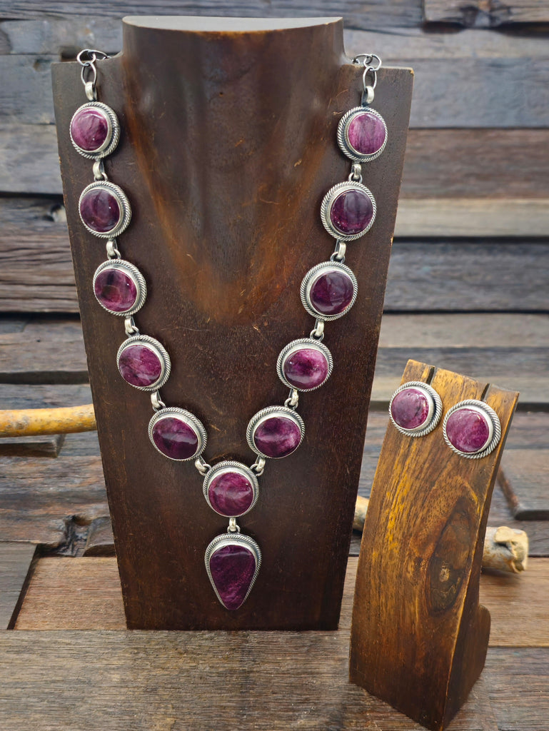 Purple Spiny Oyster Lariat Necklace and Earring Set by Navajo silversmith Darrin Livingston. All jewelry is handcrafted by Indigenous Artists.  ...