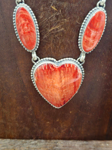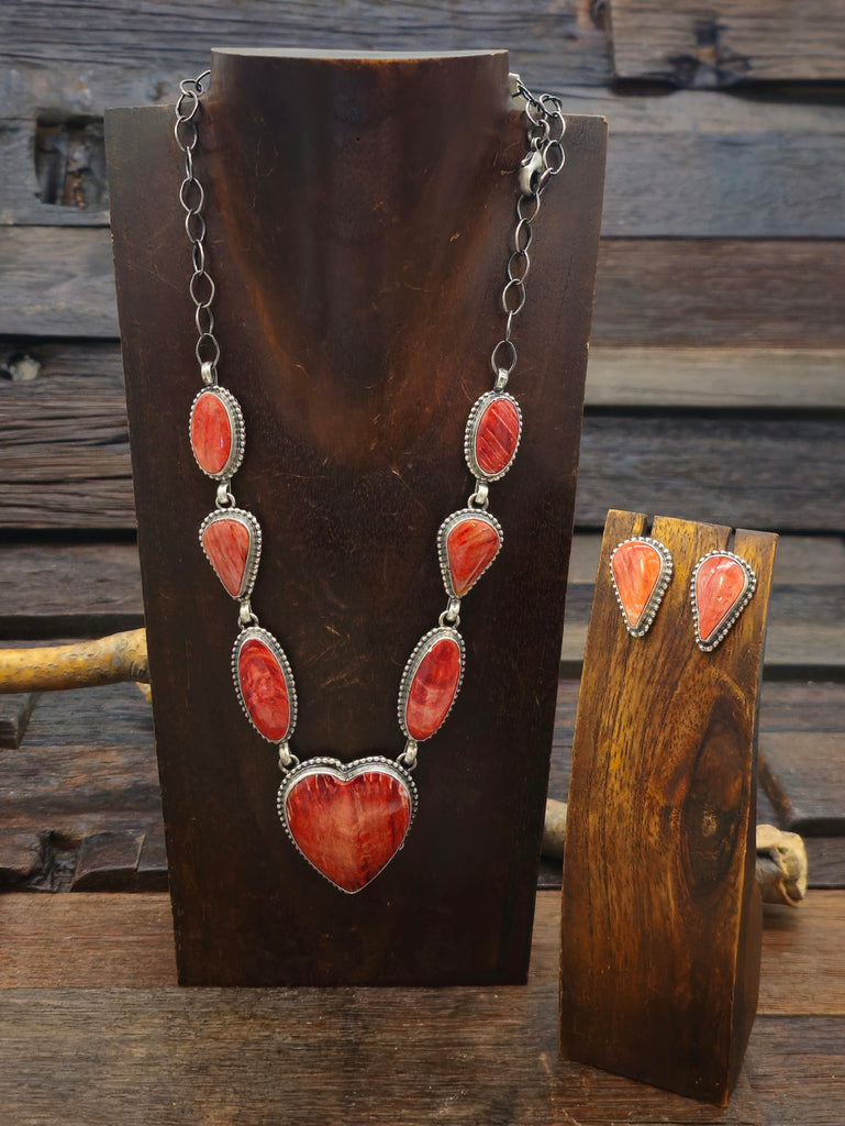 Red Spiny Oyster Heart Lariat Necklace and Earring Set by Navajo silversmith Darrin Livingston. All jewelry is handcrafted by Indigenous Artists. ...